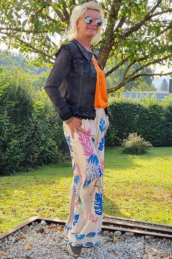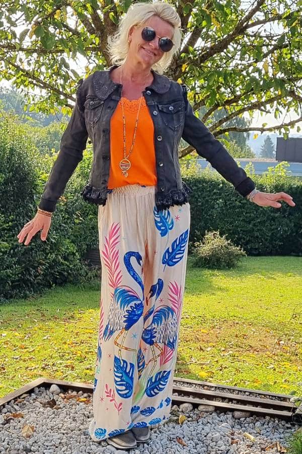 Lässige Jeans-Jacke mit Stickereien + dezenten Rüschen am Bund, leichtes Shirt mit Spitze/Spitzen-Top (in verschiedenen Farben erhältlich), super-leichte Sommerhose (Viskose-Seiden-Mischgewebe) mit Flamingo-Print (in verschiedenen Ausführungen erhältlich), lange Halskette, Ohrringe, Sonnenbrille, passende Schuhe