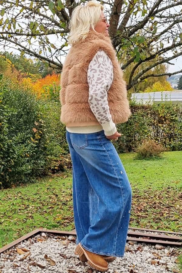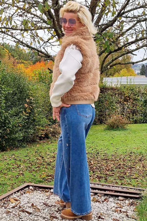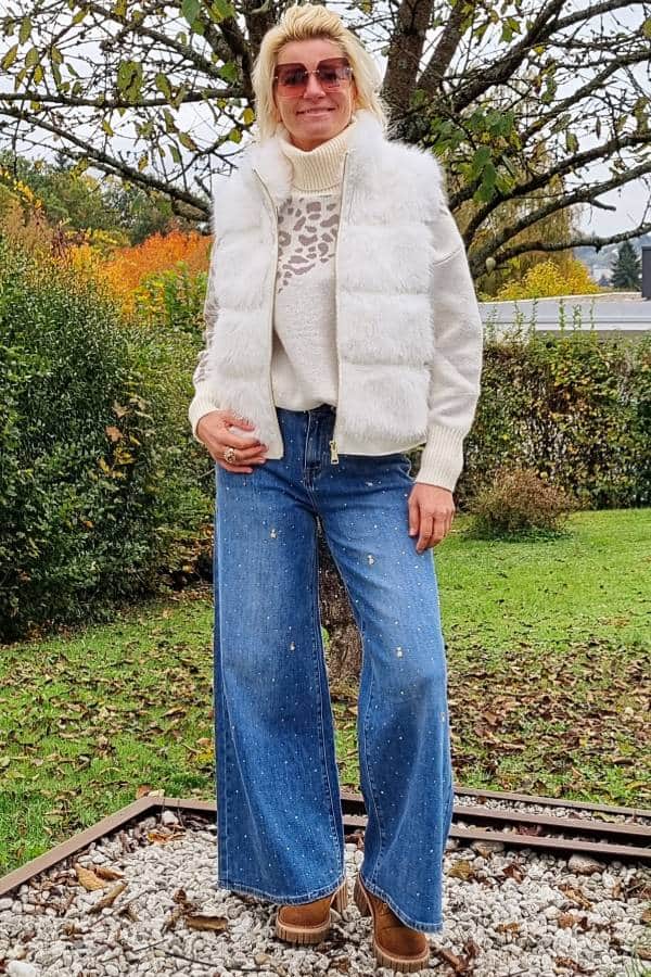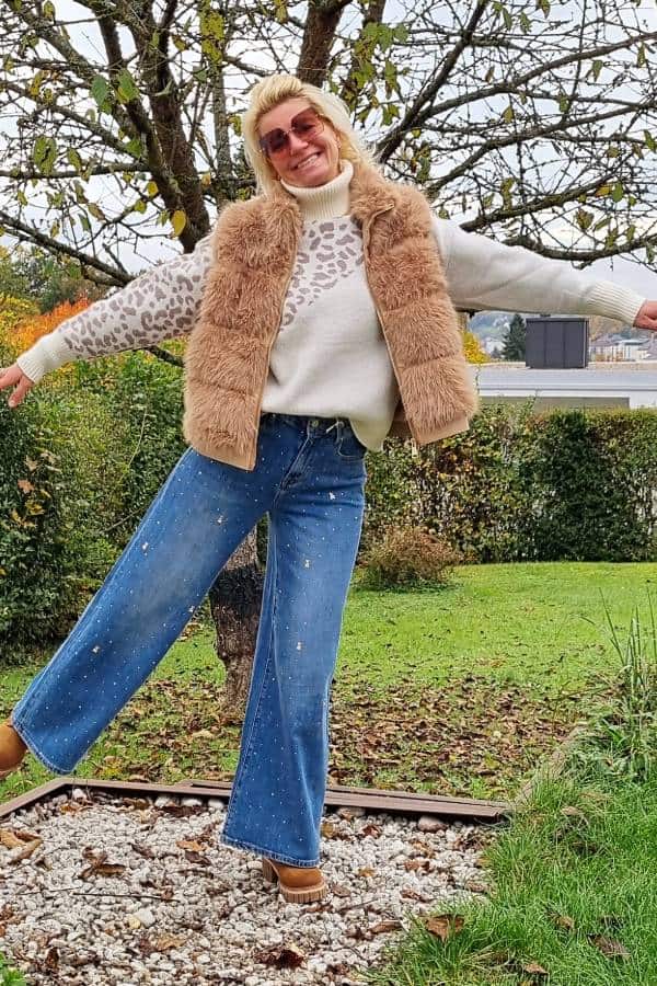Lässige Fell-Weste (kuschelige Kunstfell-Weste in verschiedenen Farben erhältlich), bequeme 5-Pocket-Jeans-Hose mit weiten Beinen (Schlag-Jeanshose) + Deko-Aufnhähern in Straß, angenehmer Rollkragen-Pullover mit Animal-Print-Akzent, Ohrringe, Sonnenbrille, passende Schuhe