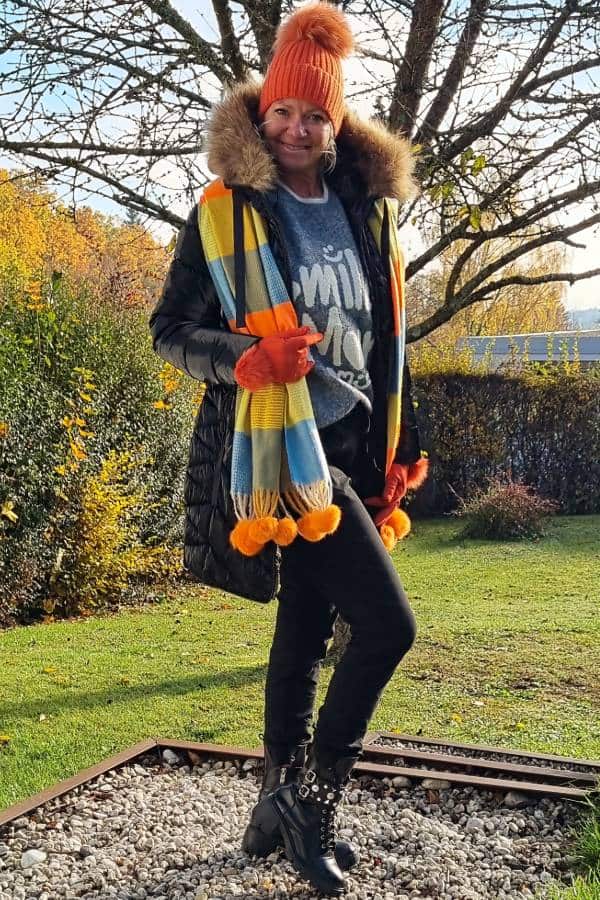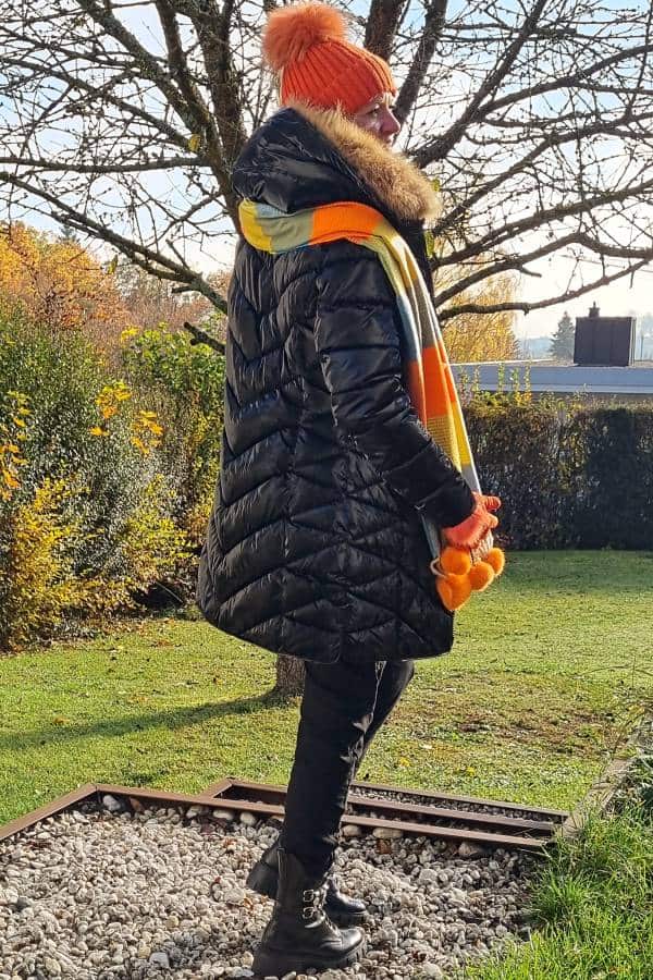 Warme lange Winter-Stepp-Jacke mit Kapuze und abnehmbarem Fell-Kragen, kuscheliger Langarm-Pullover mit Rundhals-Ausschnitt mit „Smile more“, super-bequeme Stoff-Hose im Boyfriend-Stil mit Gummizug + Glitzer-Herzen, Kuschel-Schal (100 % Viskose) mit Bommel (in 10 verschiedenen Farben erhältlich!), Bommel-Strick-Mütze (verschiedene Farben erhältlich!), Strick-Handschuhe (verschiedene Farben erhältlich!), passende Schuhe