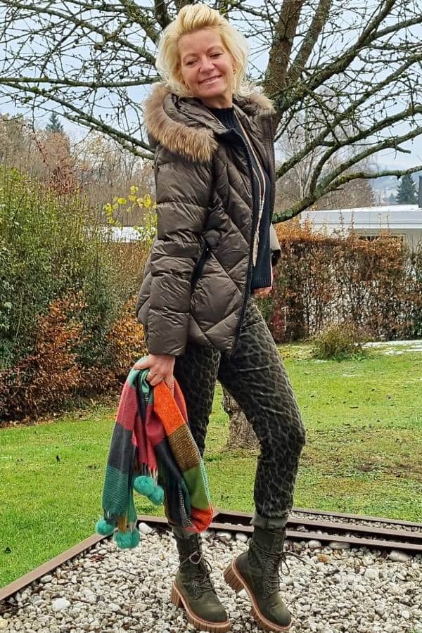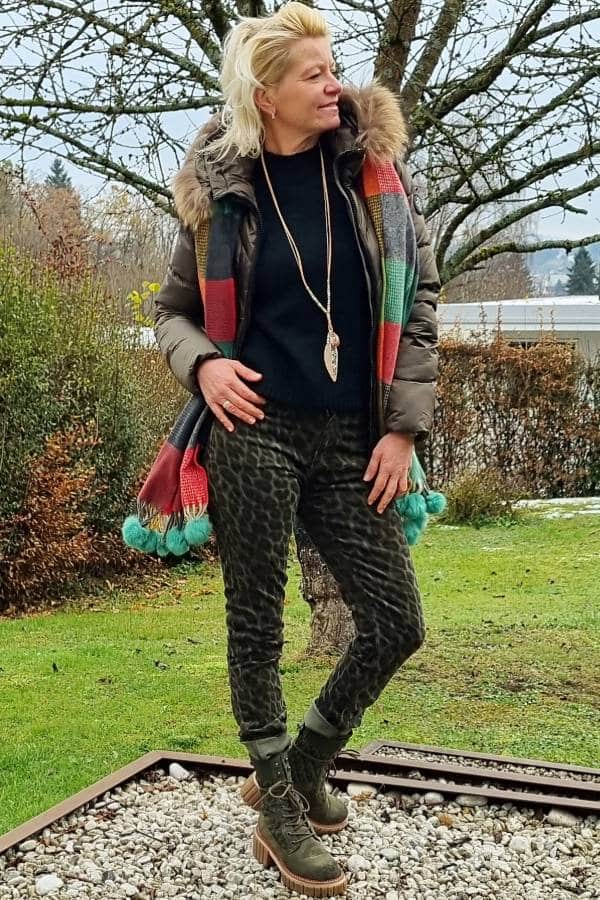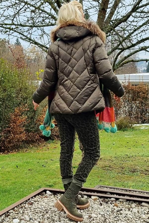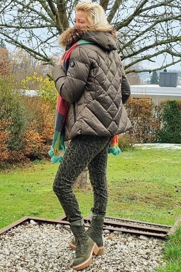 Warme Daunen-Stepp-Jacke mit Kapuze (khaki) und abnehmbarem Fell-Kragen, kuscheliger Langarm-Pullover mit Schildkröt-Kragen, stretchige Stoff-Hose in Feincord-Optik mit Animal-Print, Kuschel-Schal (100 % Viskose) mit Bommel (in 10 verschiedenen Farben erhältlich!), lange Hals-Kette, passende Schuhe